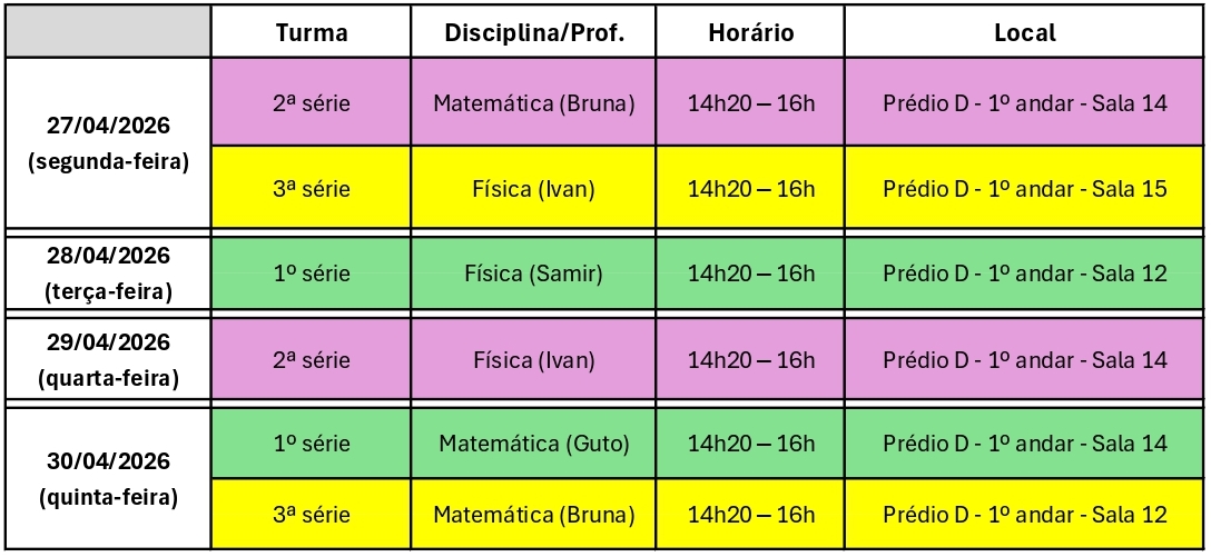Confira abaixo os horários das aulas revisionais: