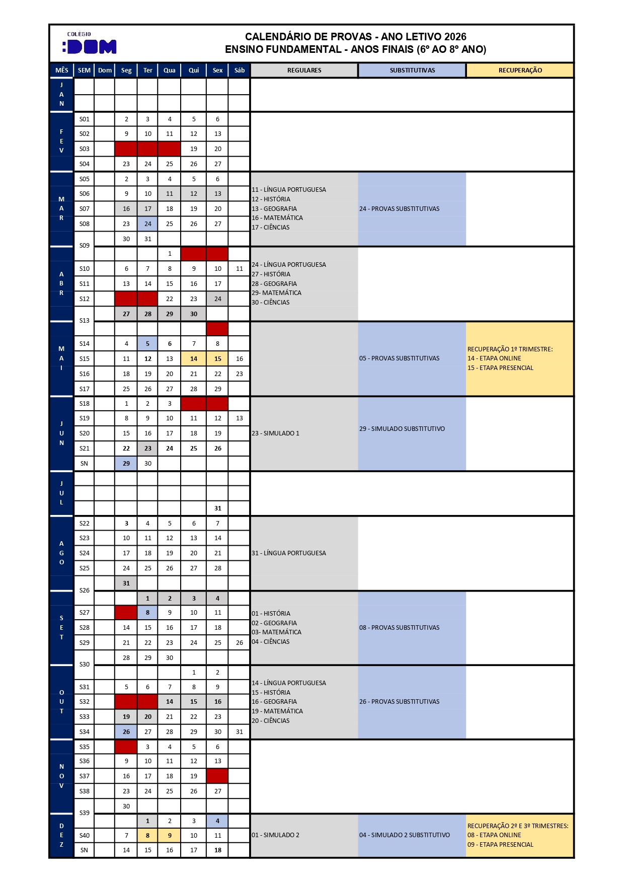 Calendário de provas – 6º ao 8º ano