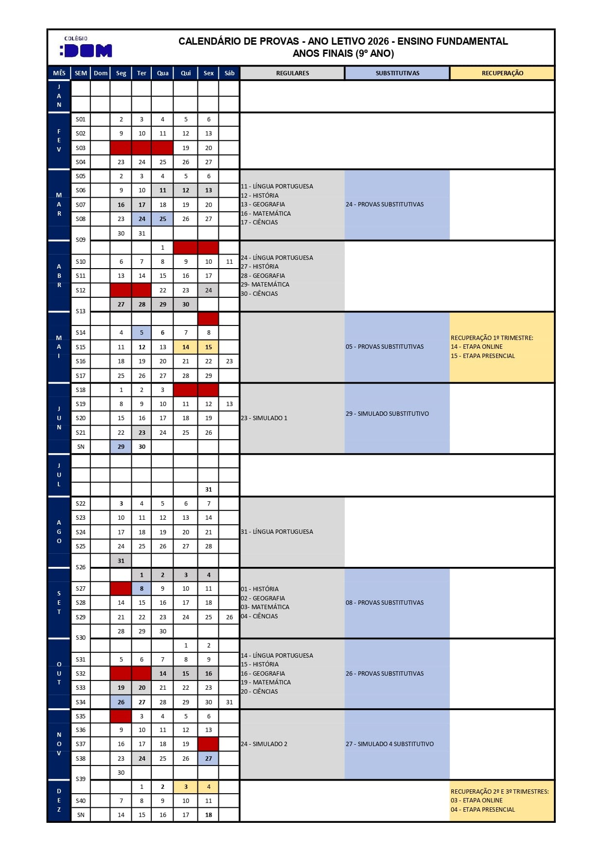 Calendário de Provas – 9º ano