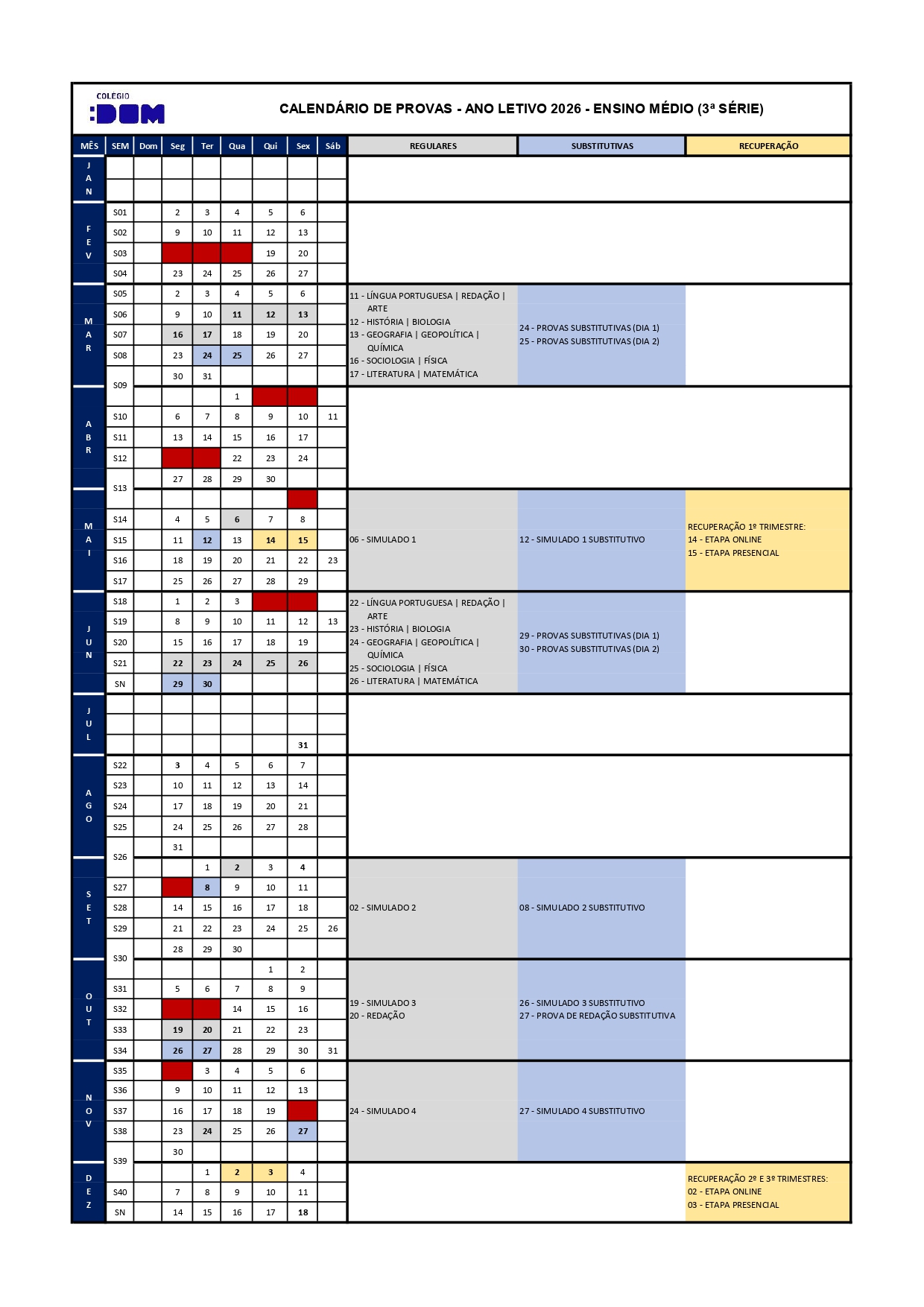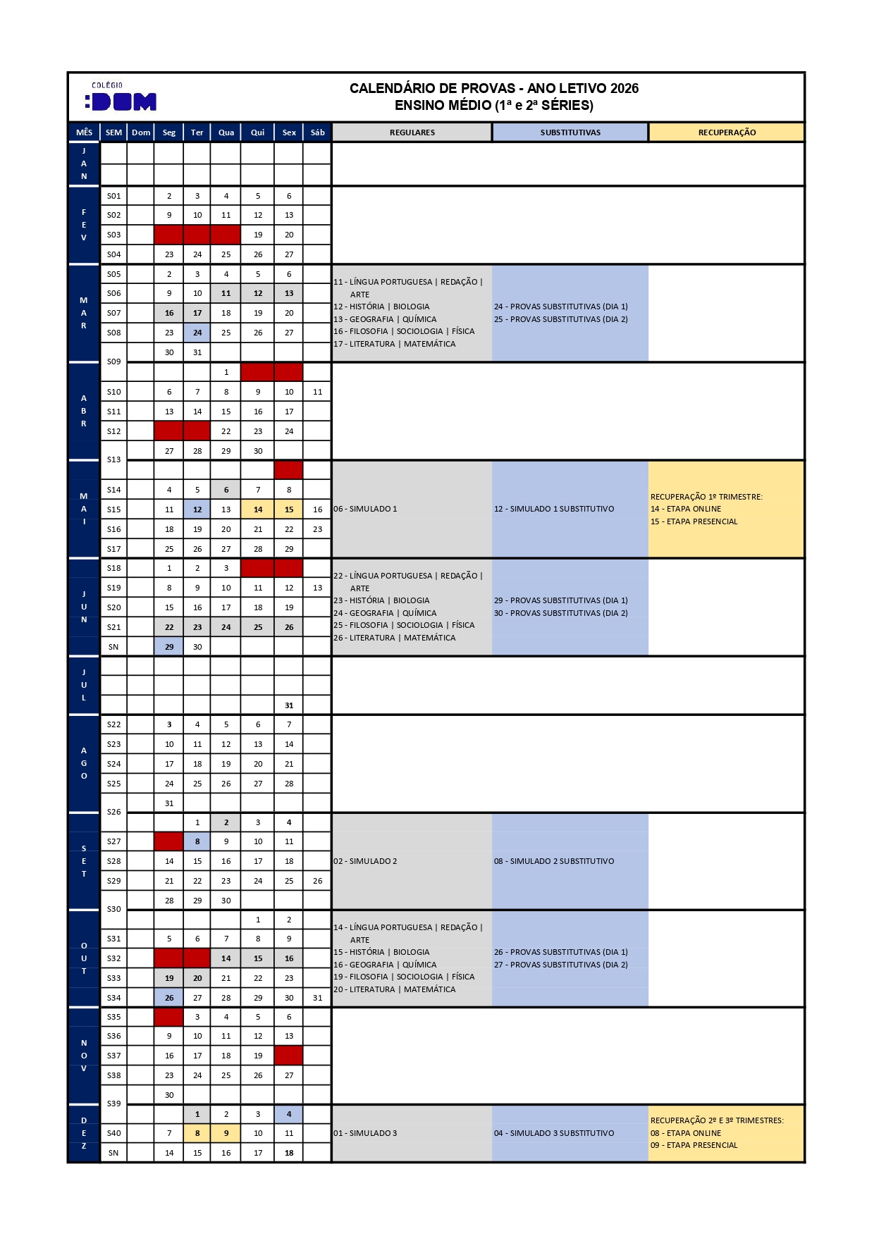 Calendário de Provas do Ensino Médio – 2026