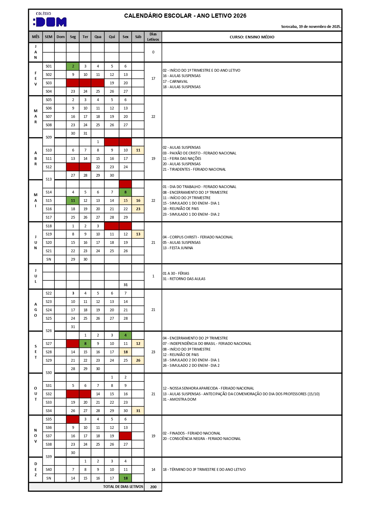Calendário Escolar do Ensino Médio – 2026